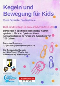 Auch in diesem Jahr bietet die Jugendleitung des VBSK wieder einen Aktionstag am Mittwoch, 19. November 2025 (Buß- und Bettag) an. Unter dem Motto „Kegeln und Bewegung für Kids“ stehen von 9:00 bis 13:00 Uhr auf der Kegelbahn der Schützengilde Bayreuth Bewegungsspiele, kleine Kegelübungen und Teamaktivitäten, die spielerisch das Gemeinschaftsgefühl fördern, auf dem Programm.